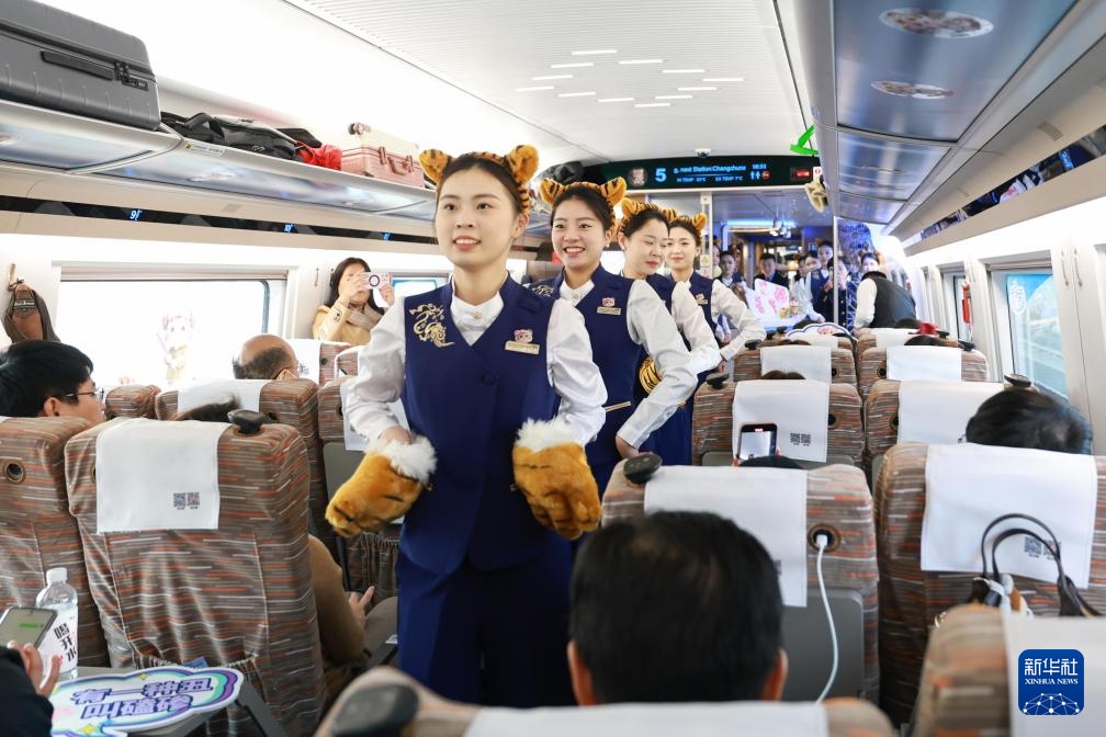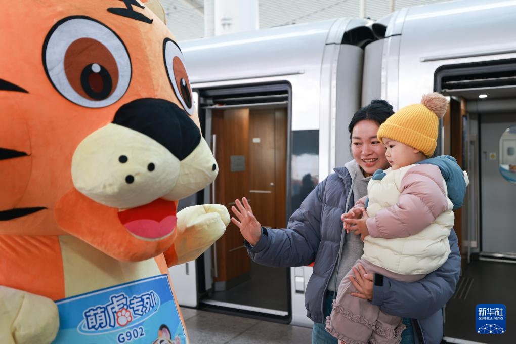 11月5日,中國鐵路哈爾濱局集團有限公司哈爾濱客運段擔當的G902次首趟“萌虎”主題列車從哈爾濱西站駛出,開往北京。列車以“龍江冰雪藍”為基調,融合東北虎元素裝飾車廂,讓旅客在旅途中感受龍江冰雪文化的獨特魅力。