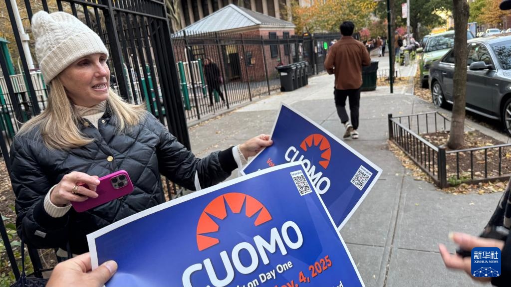 11月4日,支持者在美國紐約一個投票站外手持候選人安德魯·科莫的競選海報(手機拍攝)。