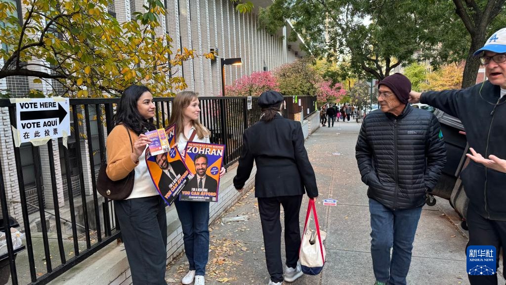 11月4日,支持者在美國紐約一個投票站外展示候選人祖赫蘭·馬姆達尼的競選海報(手機拍攝)。