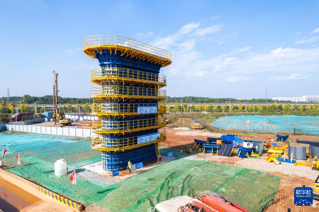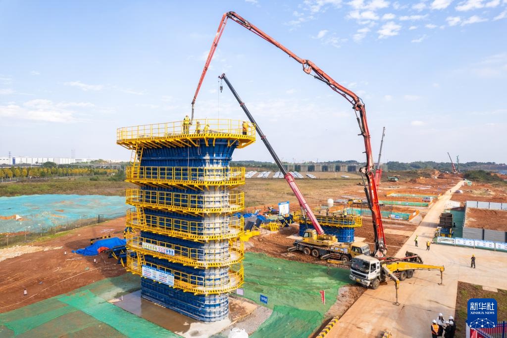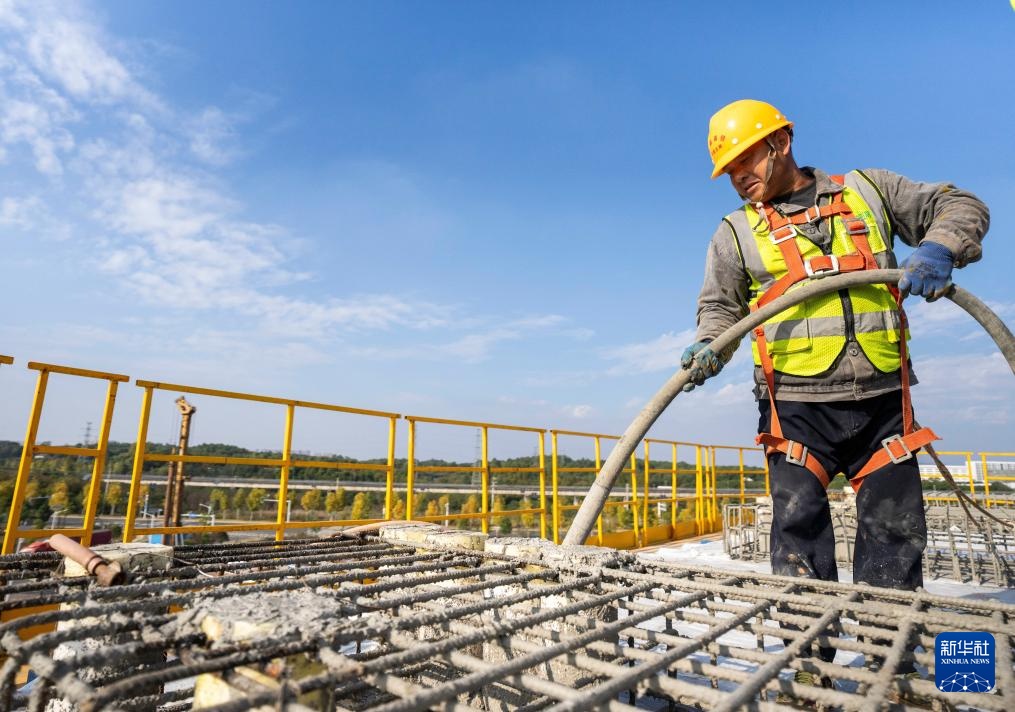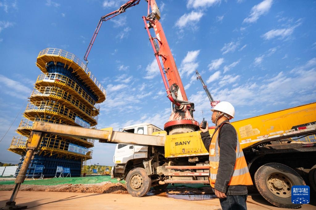 11月5日,在長贛高鐵機場高速特大橋施工現場,中鐵五局工人在溝通橋墩混凝土澆筑進展。
