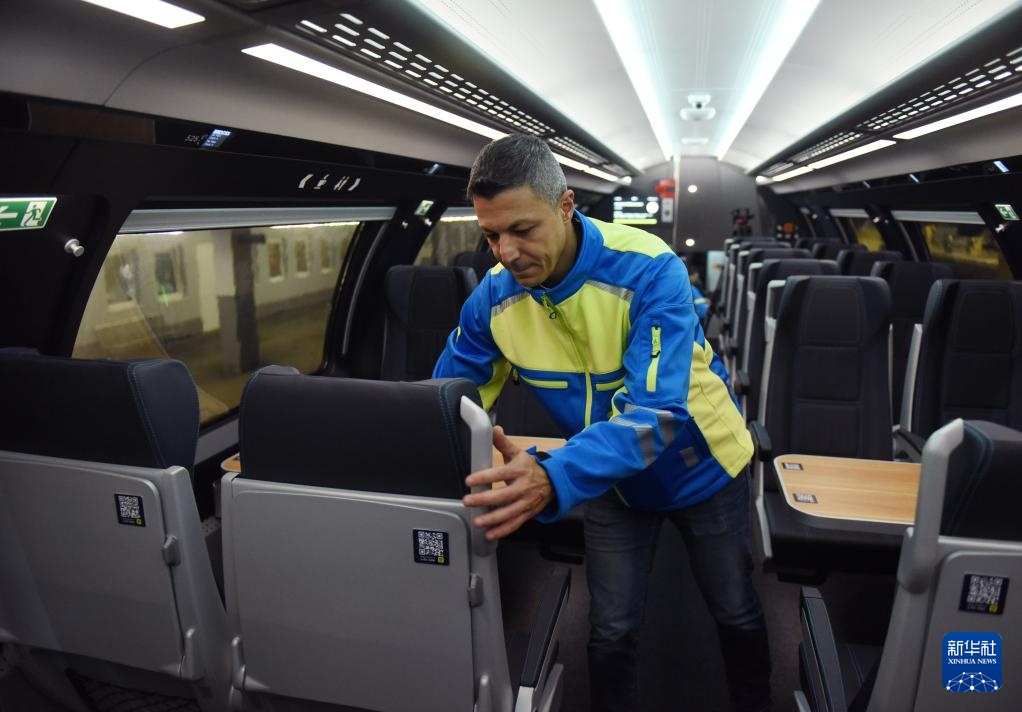 11月3日,在奧地利維也納,奧地利西部鐵路公司員工在車廂內調整座椅靠背。