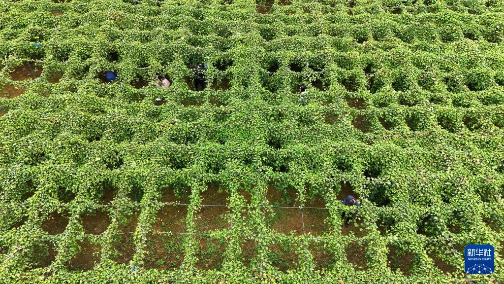 11月5日,當地村民在廣西忻城縣歐洞鄉歐洞村百香果種植基地采摘百香果(無人機照片)。