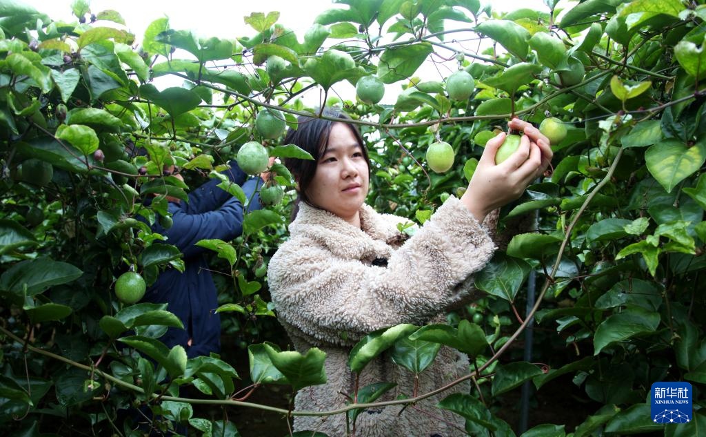 11月5日,當地村民在廣西忻城縣歐洞鄉歐洞村百香果種植基地采摘百香果。