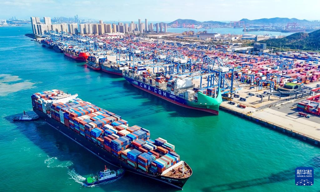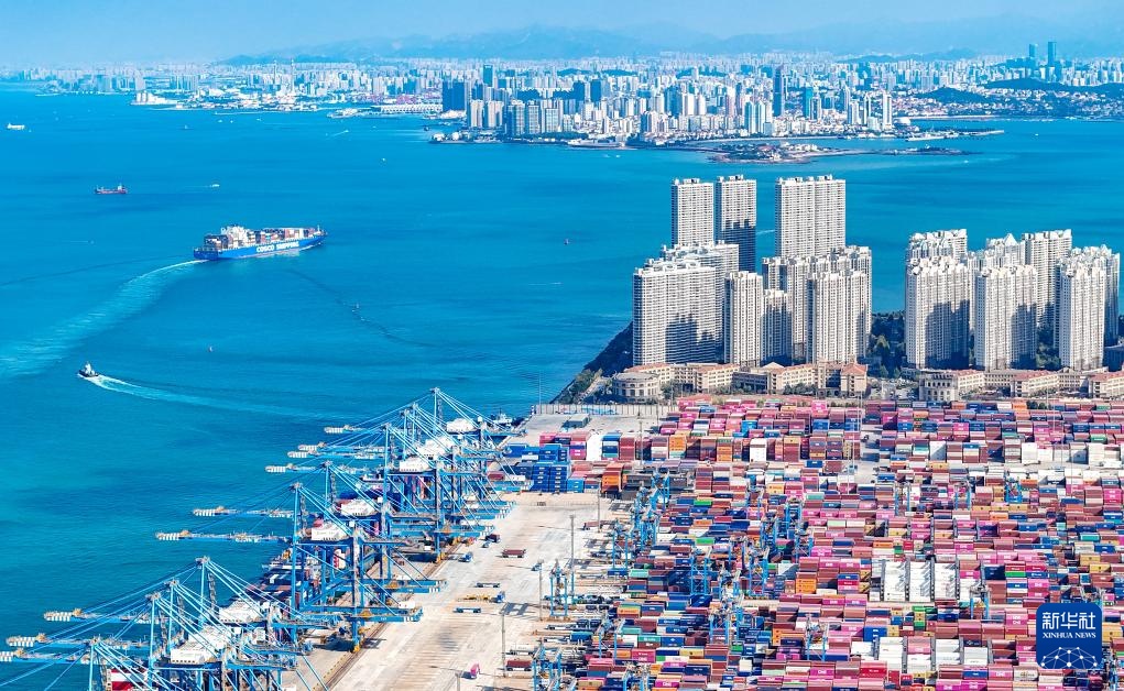 11月5日,一艘貨輪滿載貨物駛出青島自貿片區(無人機照片)。
