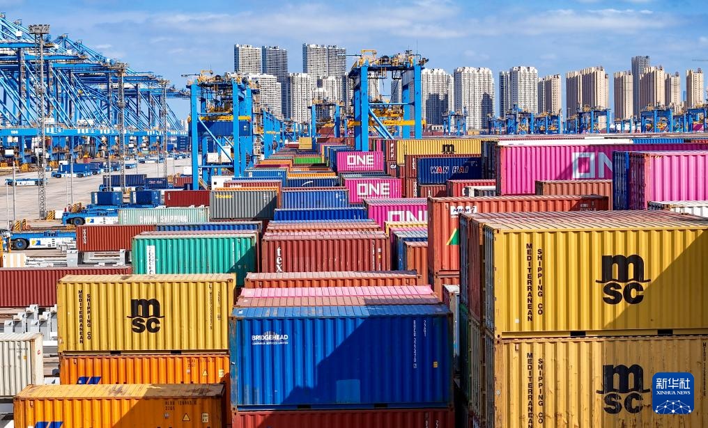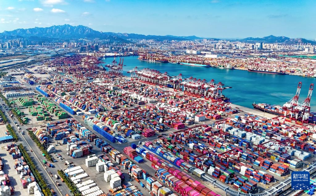 11月5日,在青島自貿片區,數十艘貨輪在裝卸貨物(無人機照片)。