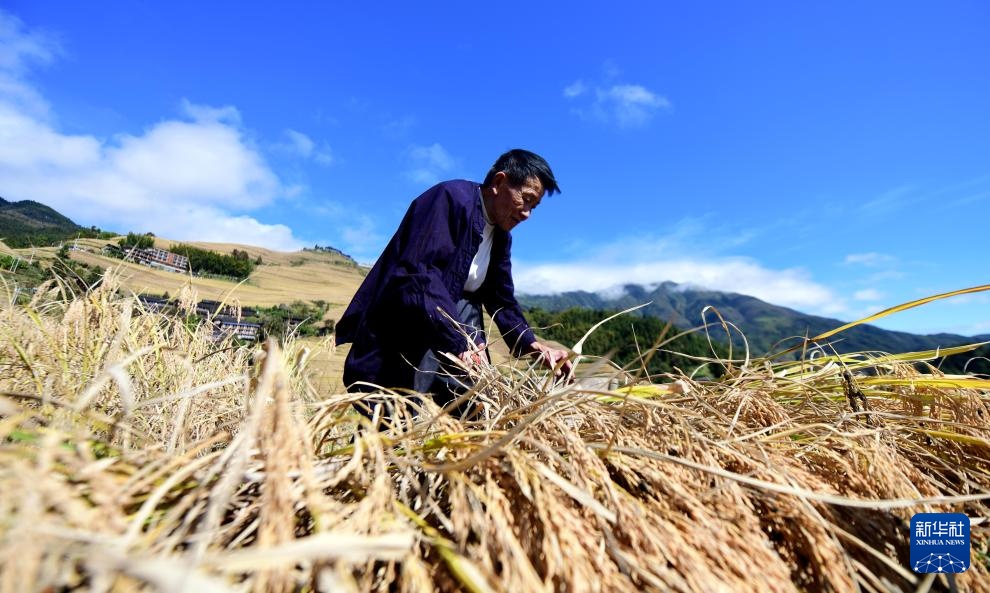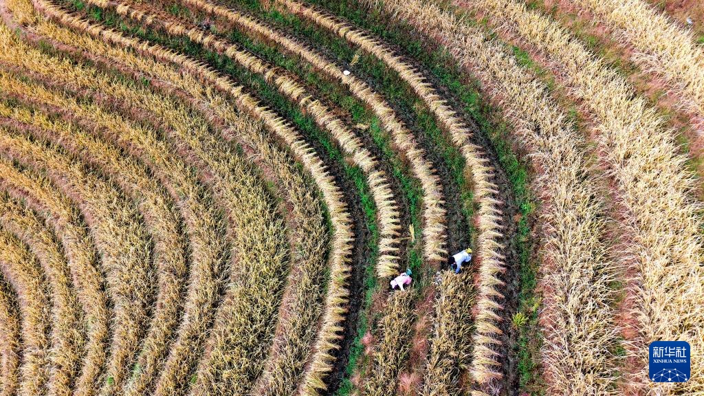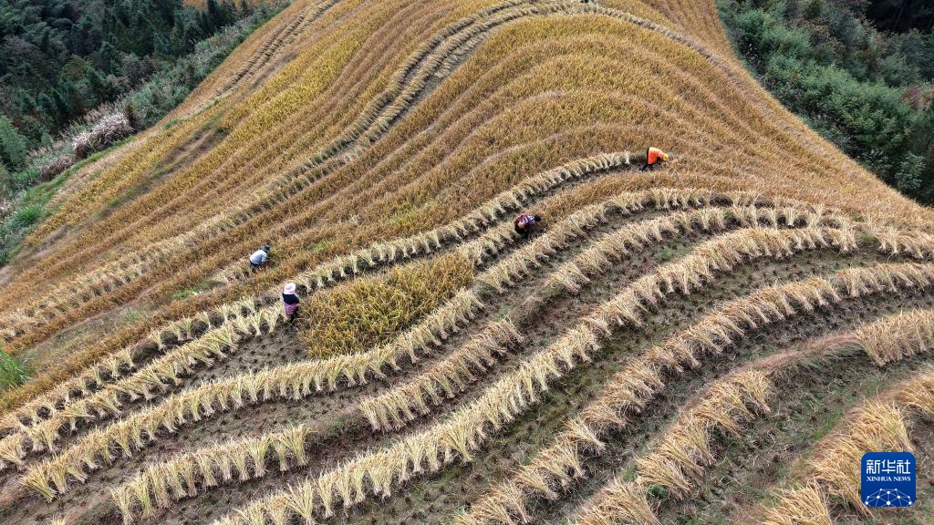 日前,廣西桂林市龍勝各族自治縣龍脊鎮大寨村種植的水稻進入收獲季節,梯田之上呈現出一派忙碌的景象。