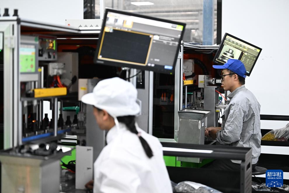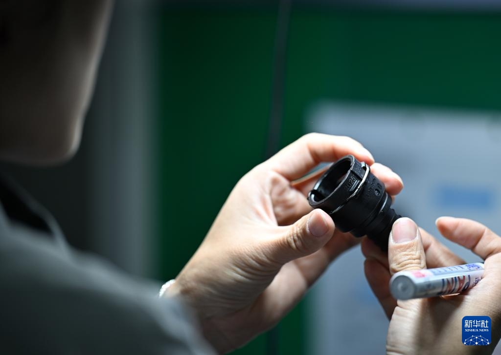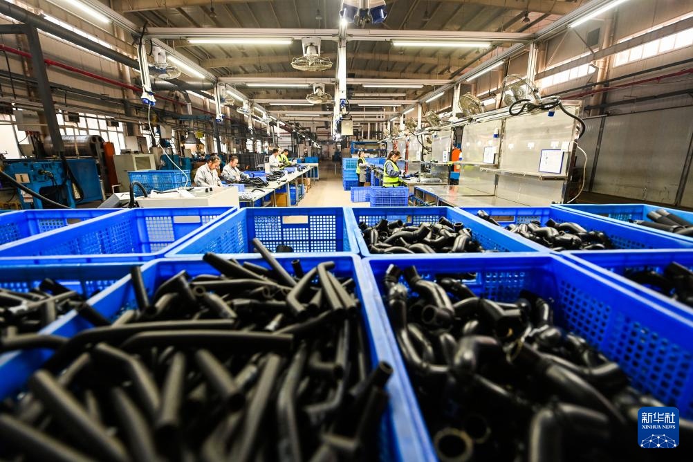 11月5日,工作人員在位于天津市濱海新區(qū)中塘鎮(zhèn)的天津鵬翎集團(tuán)股份有限公司生產(chǎn)車間檢查汽車膠管接頭。