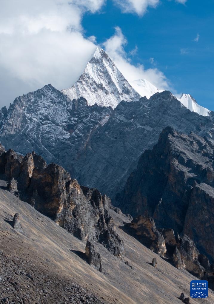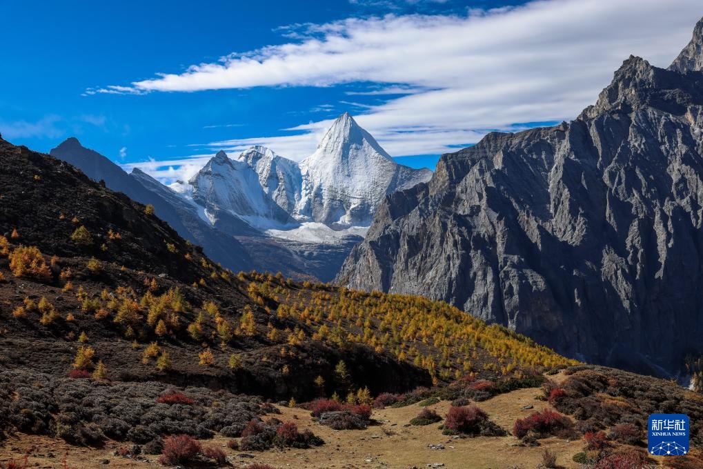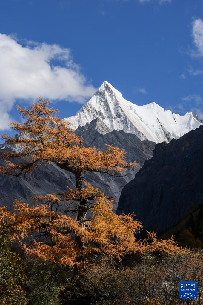 遠眺夏諾多吉雪山,藍天白云、雪山與彩林相互映襯(10月26日攝)。