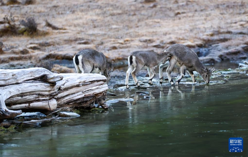 在稻城亞丁景區貢嘎措,一群巖羊在喝水(10月27日攝)。