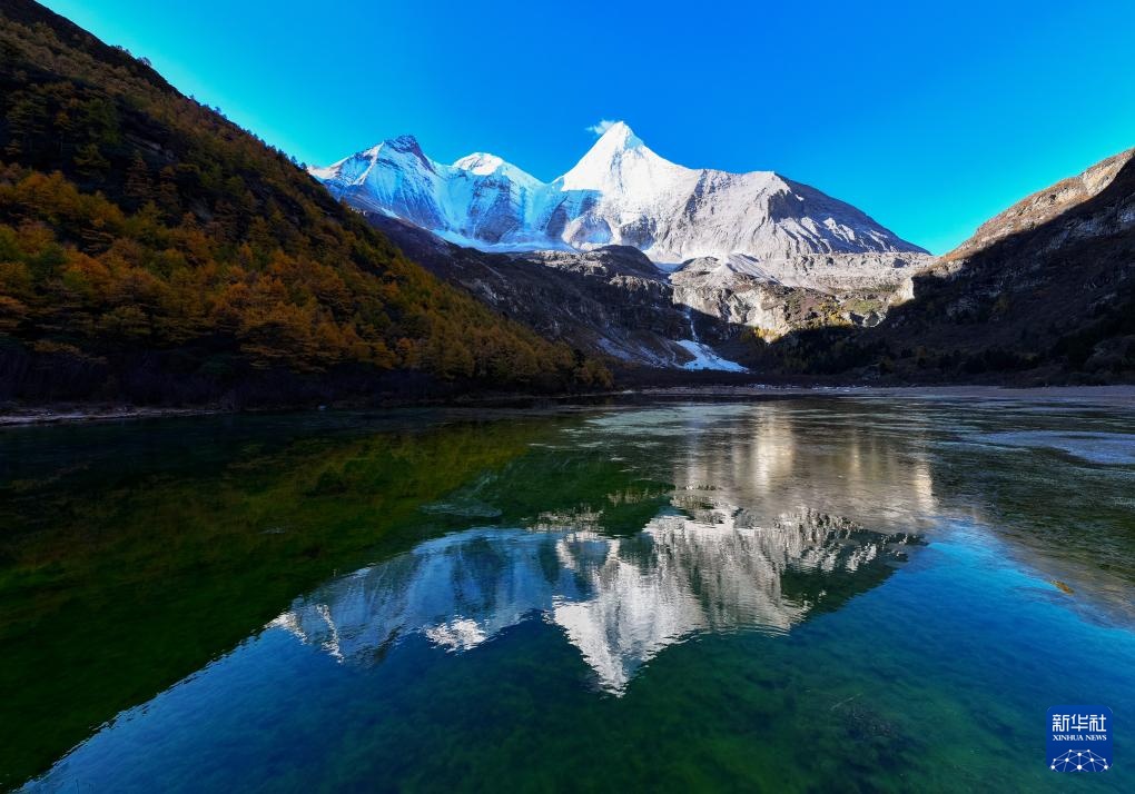 央邁勇雪山倒映在貢嘎措中(10月27日攝,無人機照片)。