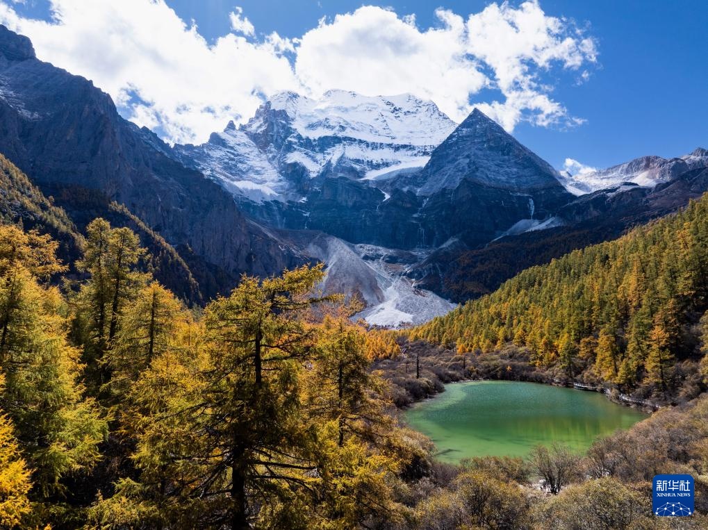稻城亞丁景區波擁措和三座雪山同框(10月28日攝,無人機照片)。