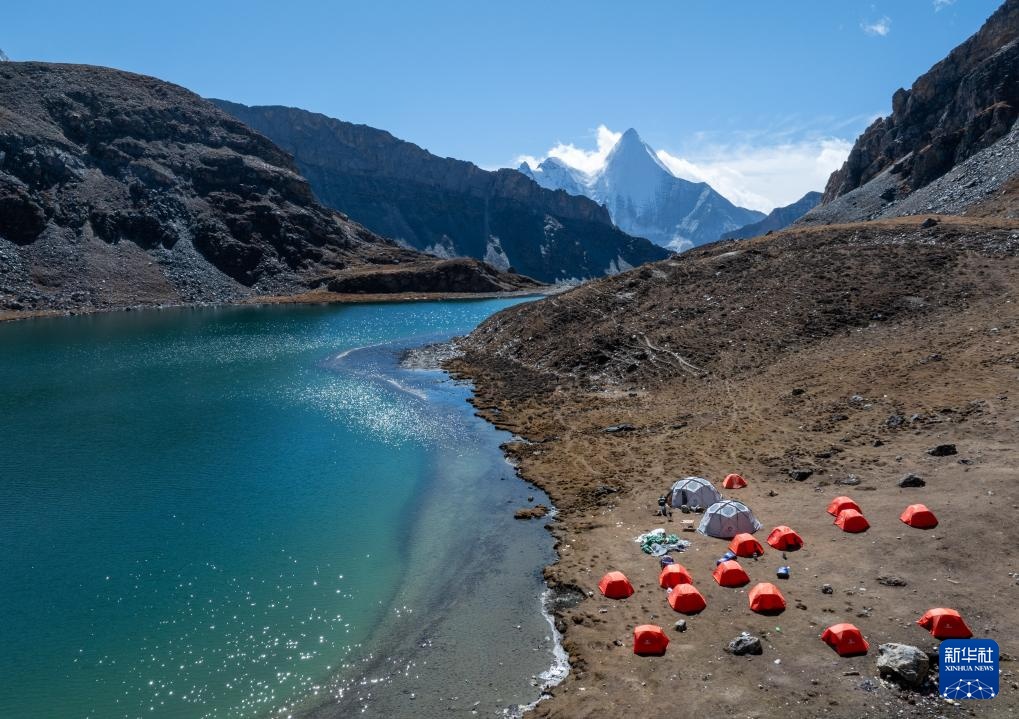 在稻城亞丁景區波擁措,湖邊搭著徒步愛好者的帳篷(10月28日攝,無人機照片)。