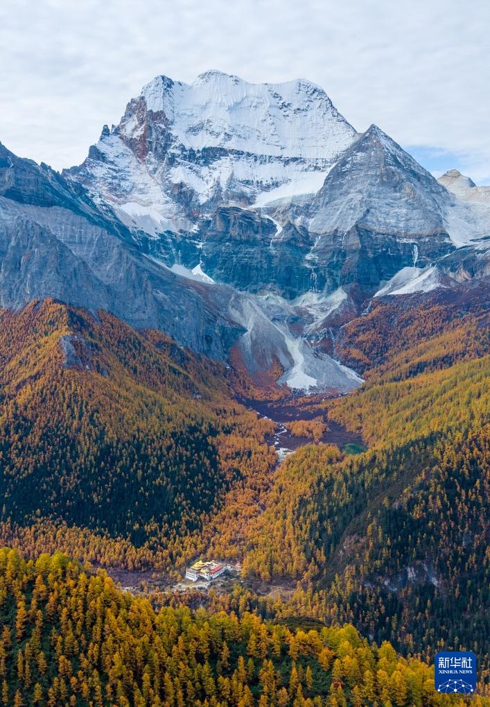 俯瞰仙乃日雪山和彩林(10月30日攝,無人機照片)。