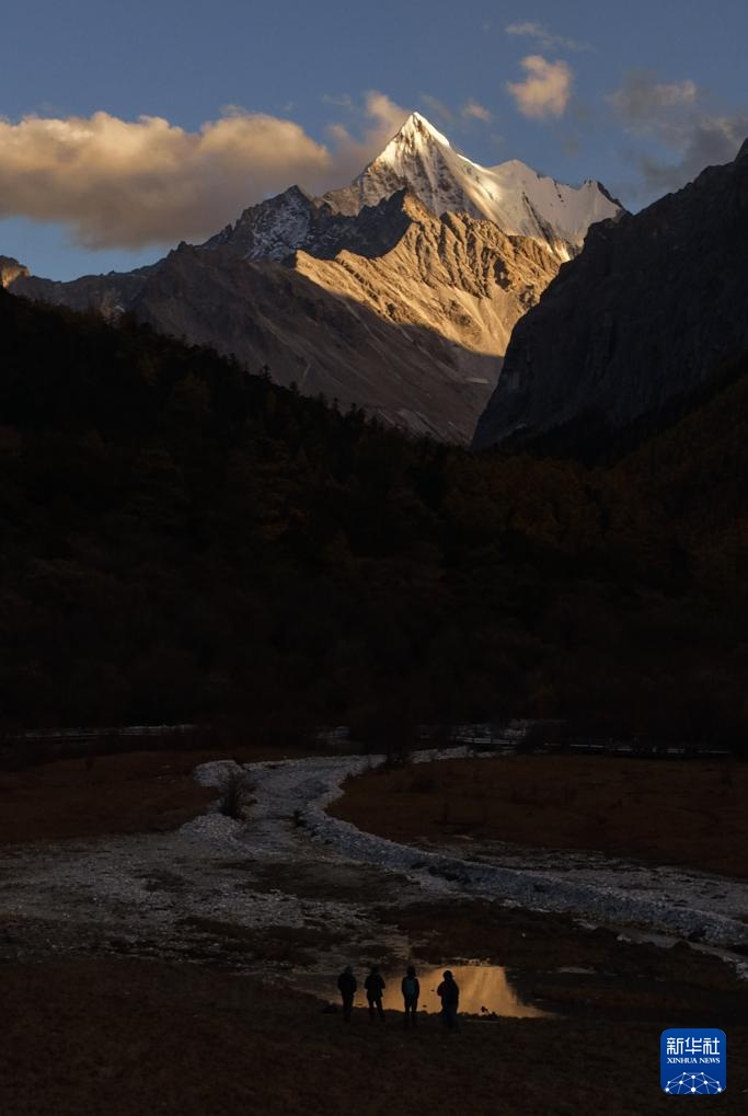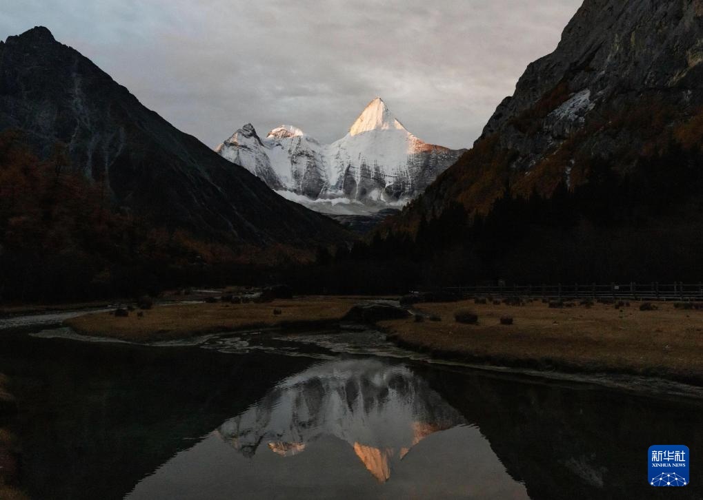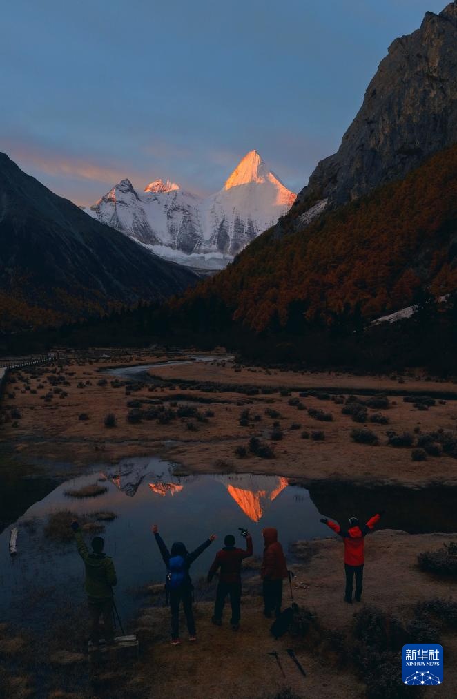 日落時分,夏諾多吉雪山倒映在水中(10月26日攝)。