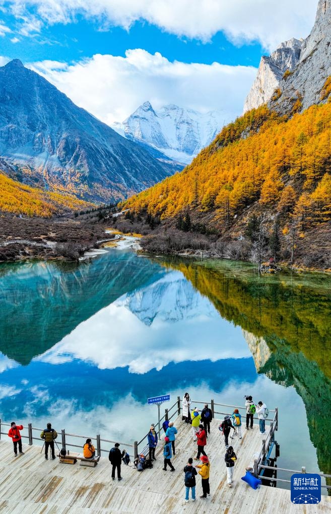 藍天白云、雪山和彩林倒影在稻城亞丁景區圣水湖中(10月29日攝)。
