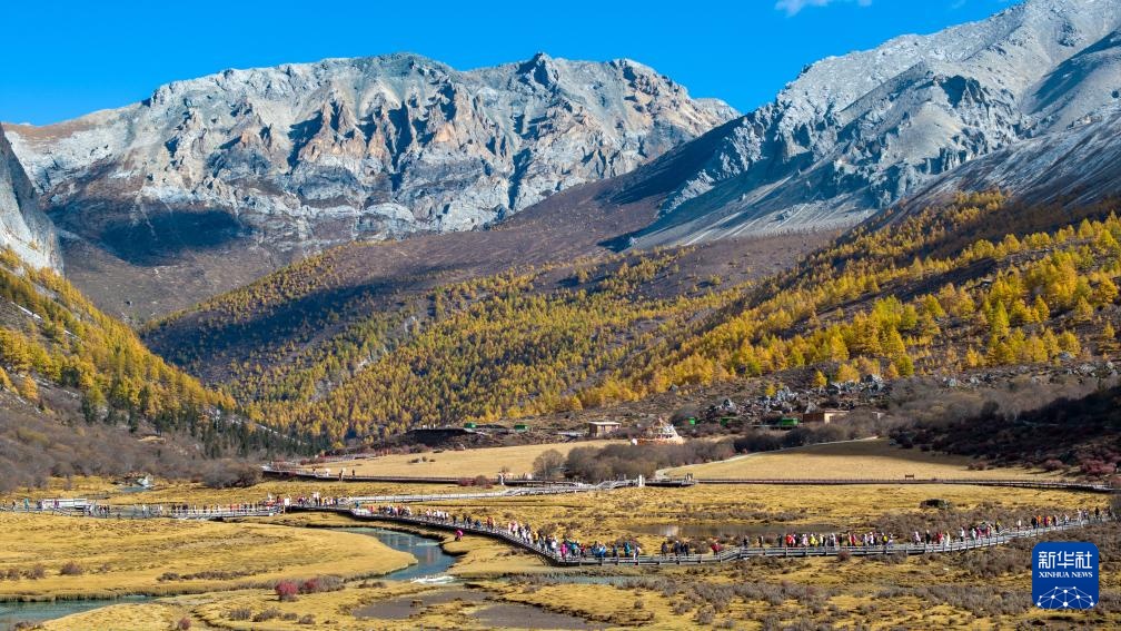 游人走在稻城亞丁景區洛絨牛場步行棧道上(10月29日攝,無人機照片)。
