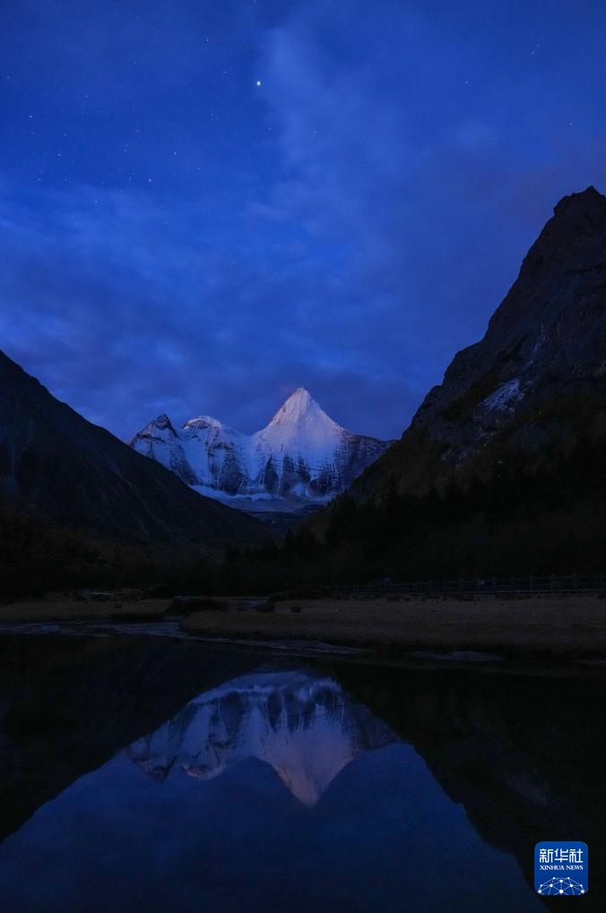 日出時分,央邁勇雪山倒映在水中(10月30日攝)。