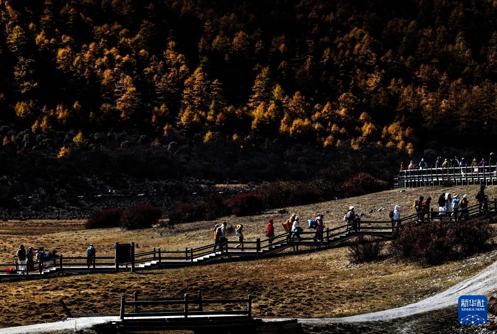 在稻城亞丁景區,游人沿著步行棧道游覽(10月29日攝)。