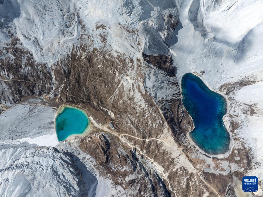 俯瞰稻城亞丁景區的五色海(右)和牛奶海(10月27日攝,無人機照片)。