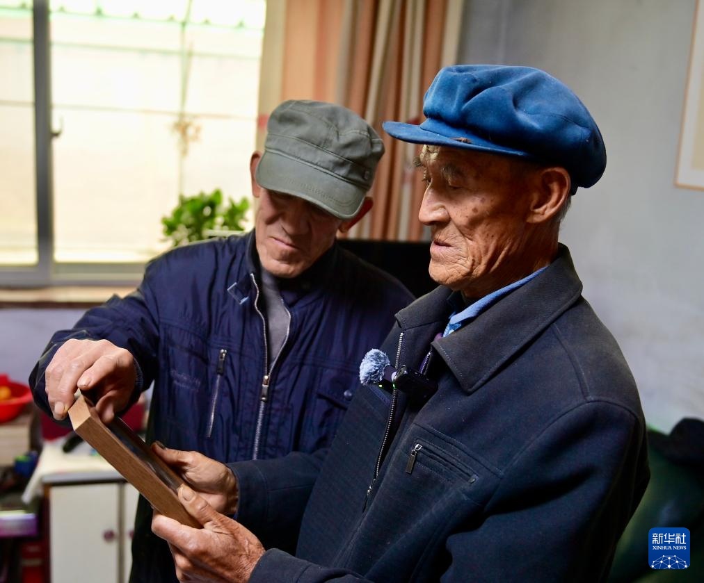 11月5日,楊樹武(左)和楊忠貴烈士的弟弟楊忠利一起端詳楊忠貴烈士遺像。