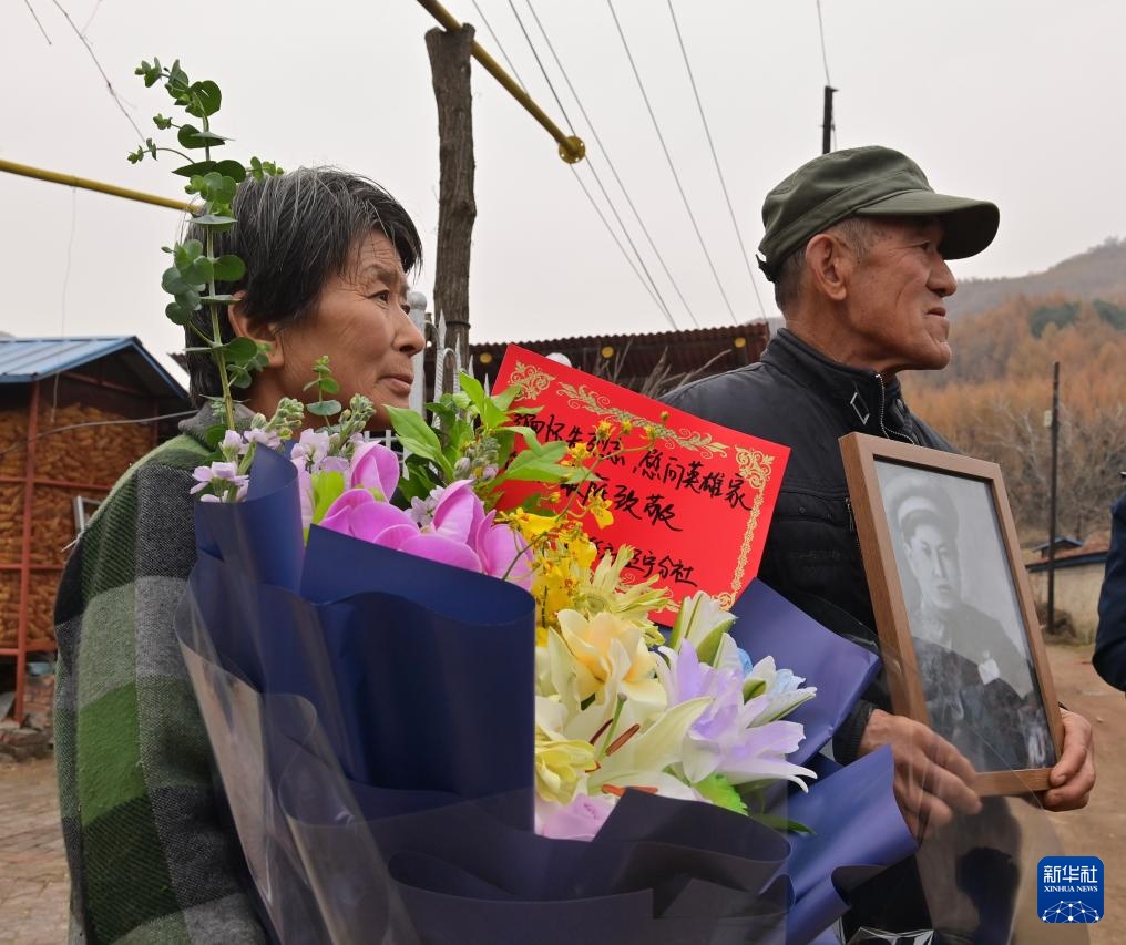 11月5日,楊樹武(右)和妻子梁桂琴手捧楊忠貴烈士遺像和鮮花站在家門口。