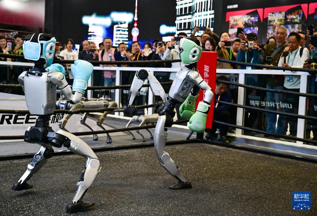 11月6日,在第八屆進博會宇樹科技展臺,人形機器人進行格斗表演。