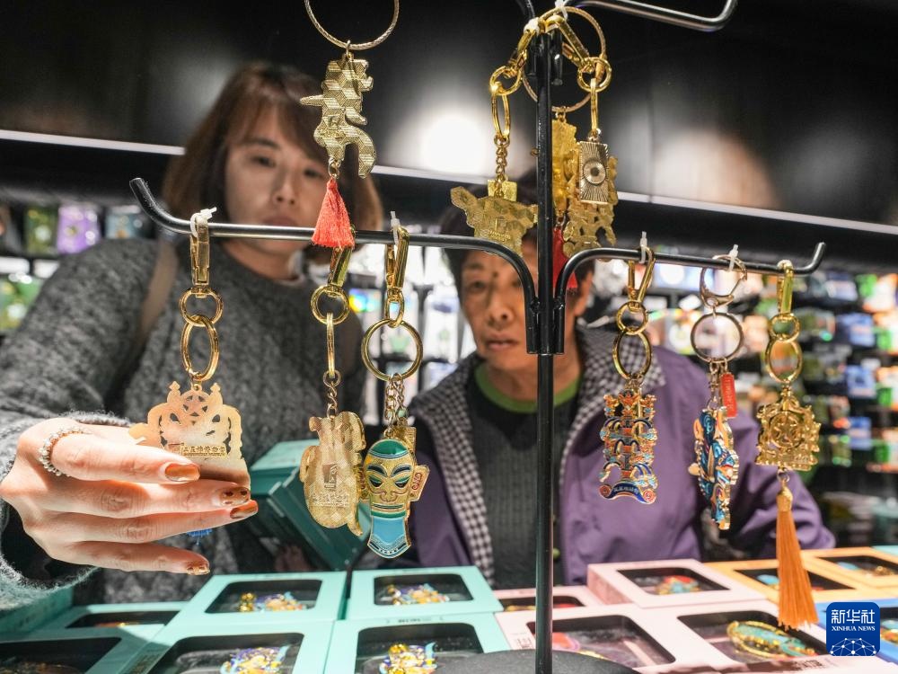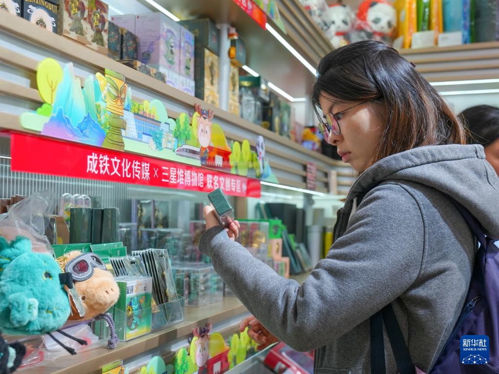 游客在四川省廣漢市三星堆博物館內的文創商店選購文創產品(10月30日攝)。