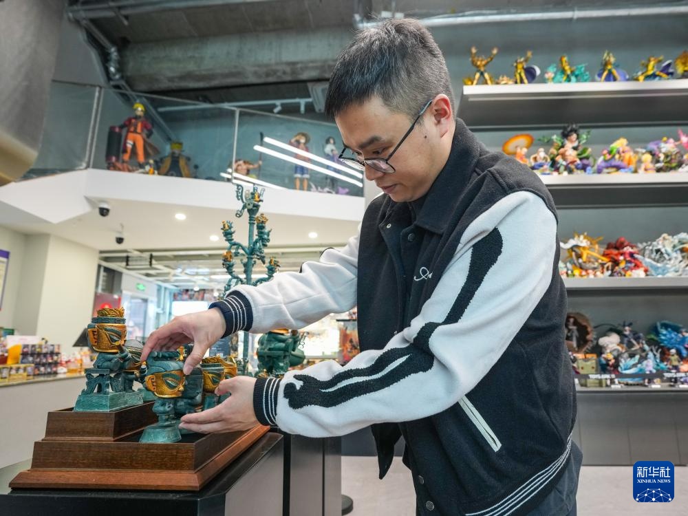 11月5日,在成都天府國際動漫城,與三星堆博物館合作的文創產品策劃運營師曾舟在擺放自己設計的三星堆文創盲盒新品。