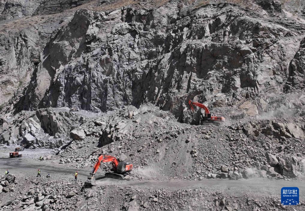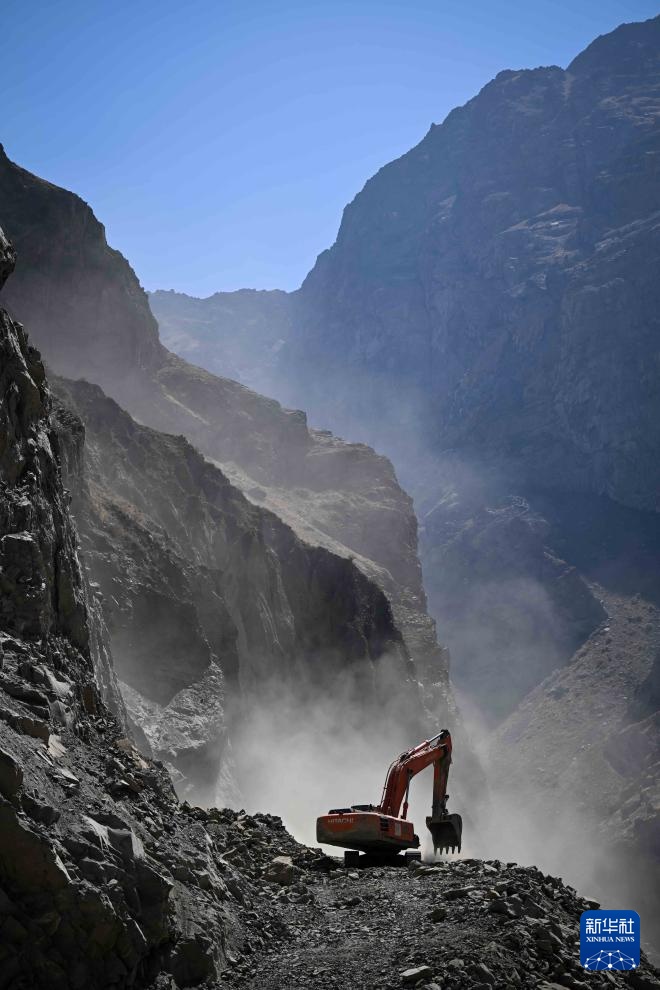 這是9月11日在塔吉克斯坦卡拉依洪姆村附近拍攝的中塔公路二期工程施工現(xiàn)場。