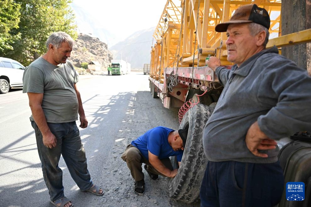 9月11日,在塔吉克斯坦卡拉依洪姆村附近,司機(jī)圖拉洪對著鏡頭豎起大拇指。