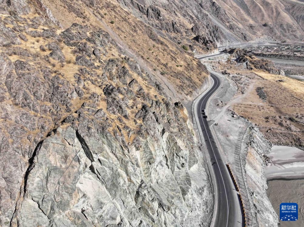 這是9月11日在塔吉克斯坦卡拉依洪姆村附近拍攝的中塔公路二期路段(無人機(jī)照片)。