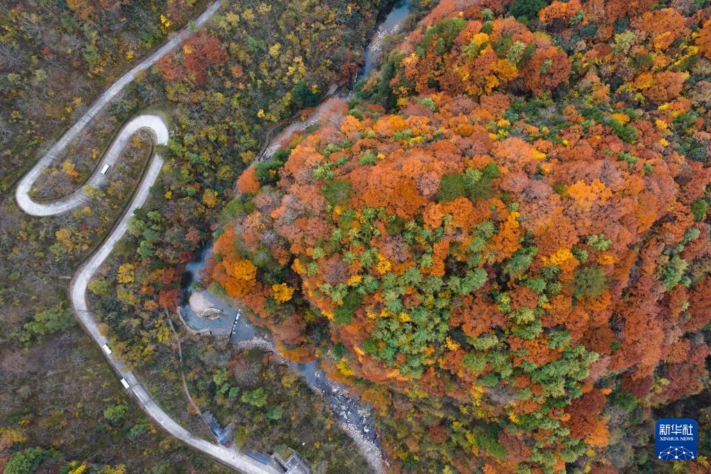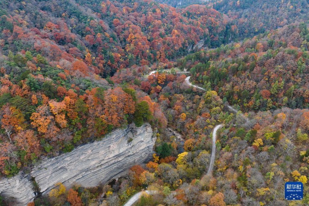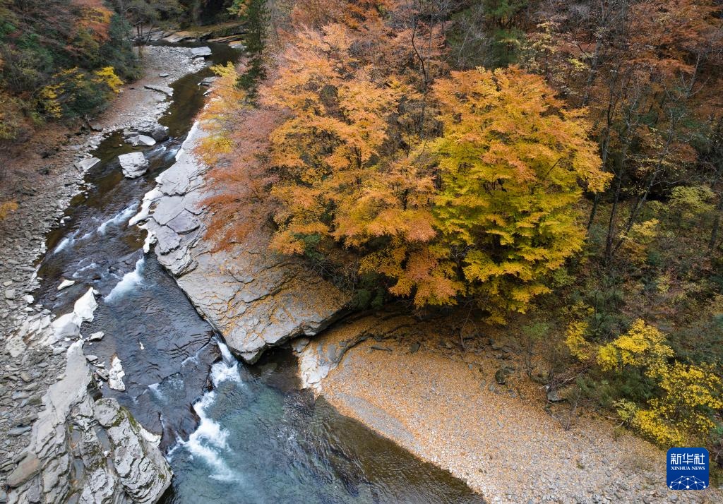 漢中市南鄭區(qū)境內(nèi)的黎坪國(guó)家森林公園秋色(11月5日攝,無(wú)人機(jī)照片)。