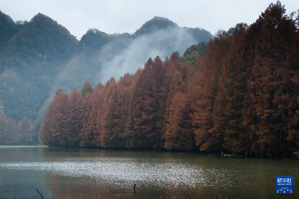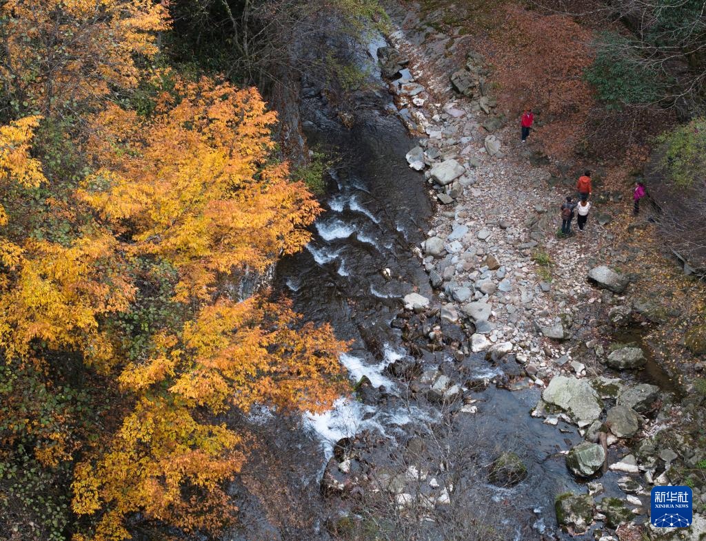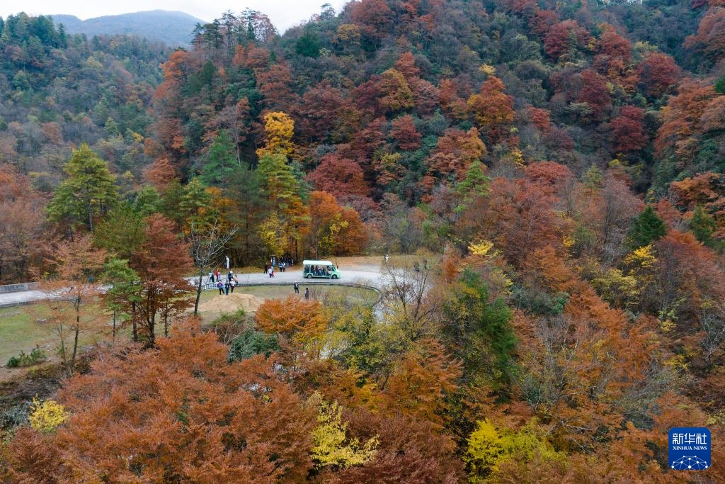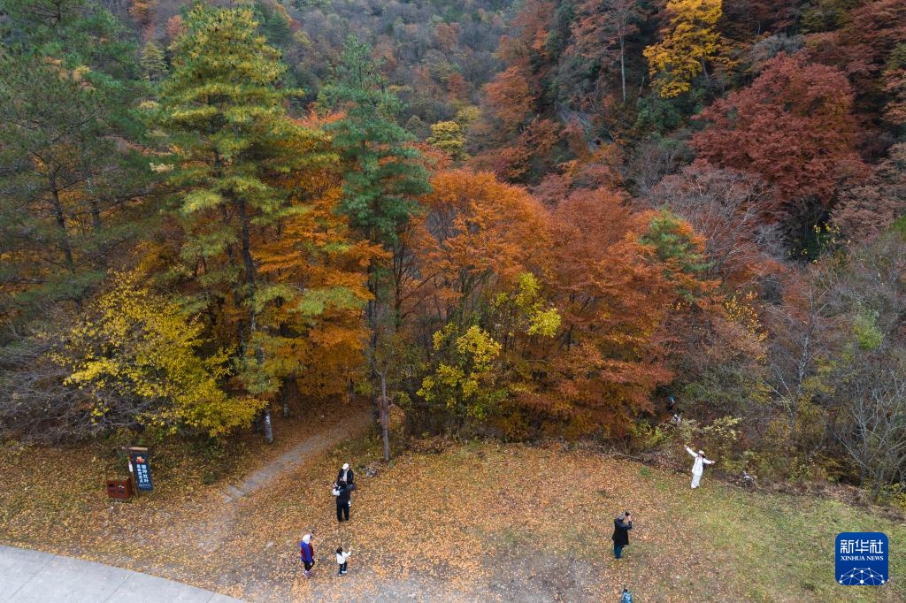 11月5日,游人在位于漢中市南鄭區(qū)的黎坪國(guó)家森林公園內(nèi)拍照游玩(無(wú)人機(jī)照片)。