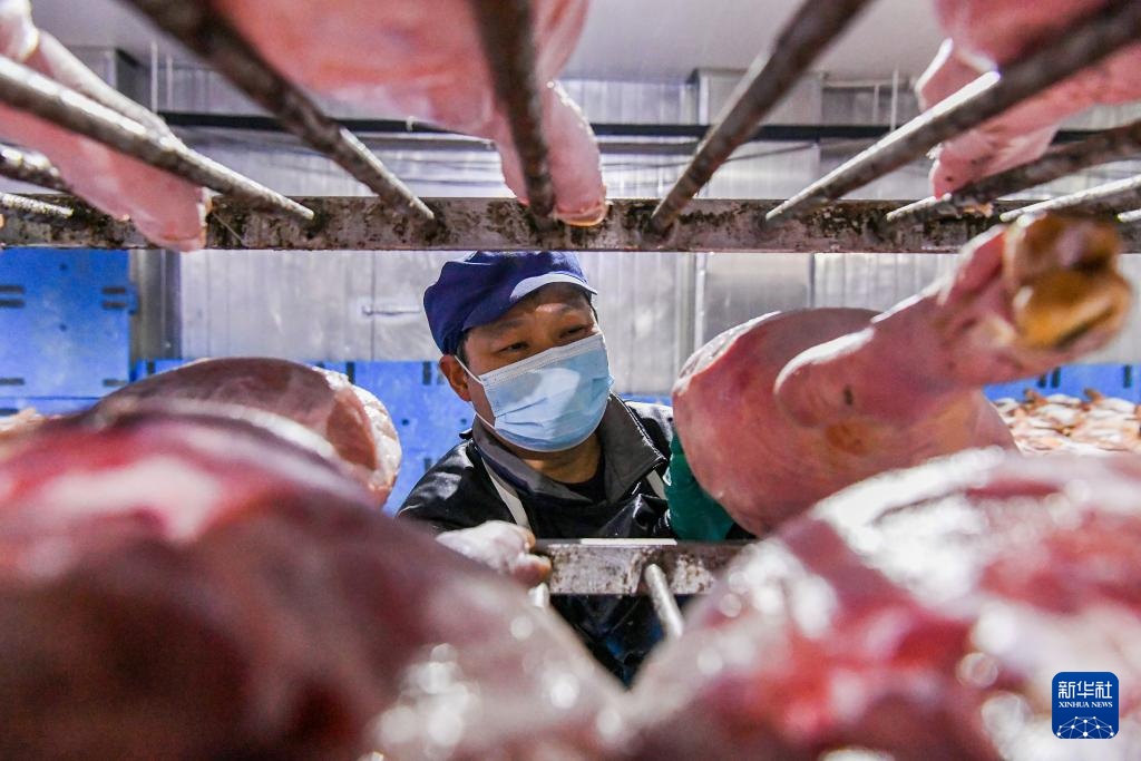 11月6日,在浙江省金華金年火腿有限公司車(chē)間內(nèi),技師在堆疊火腿。
