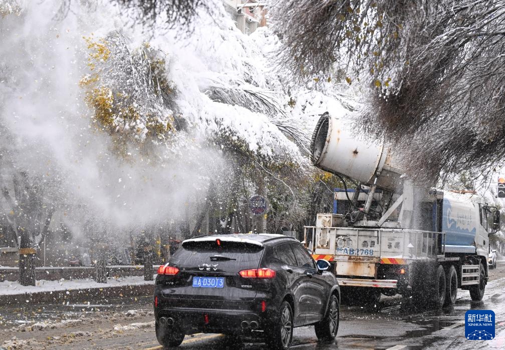 11月6日,在烏魯木齊市紅山路,環衛部門工作人員利用機械吹落樹頂積雪,以防積雪壓斷樹枝,排除安全隱患。