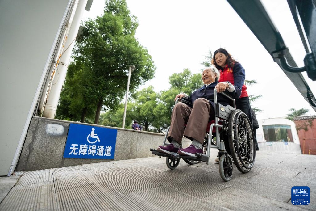 11月6日,在長沙市望城區(qū)高塘嶺街道湘陵社區(qū),志愿者推行行動不便的居民通過無障礙通道。