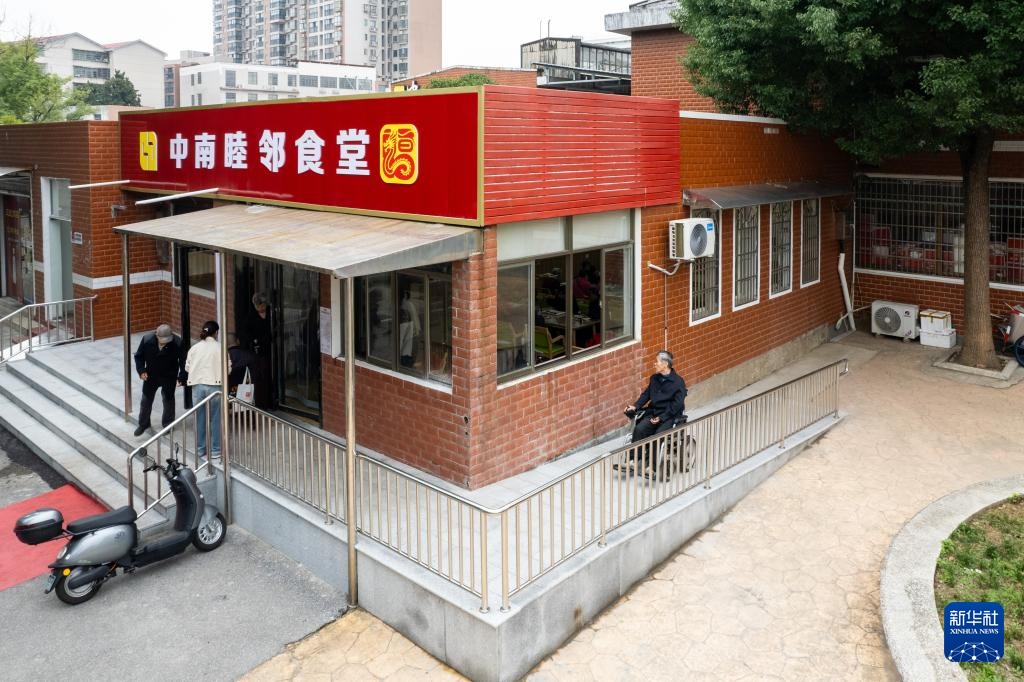 11月6日,在長沙市望城區(qū)高塘嶺街道中南社區(qū),行動不便的居民通過無障礙通道進(jìn)入睦鄰食堂就餐(無人機照片)。