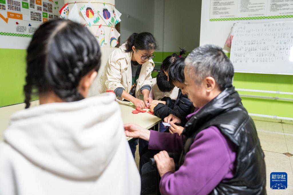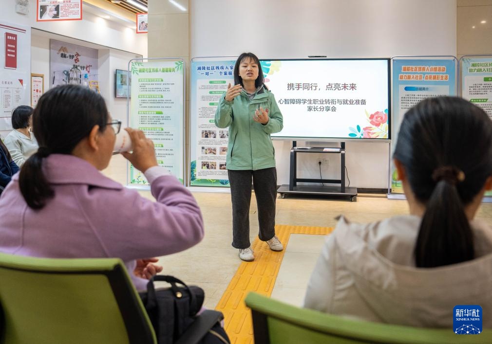 11月6日,在長沙市望城區(qū)高塘嶺街道湘陵社區(qū),志愿者(右二)為有心智障礙學(xué)生的家長進(jìn)行指導(dǎo)。