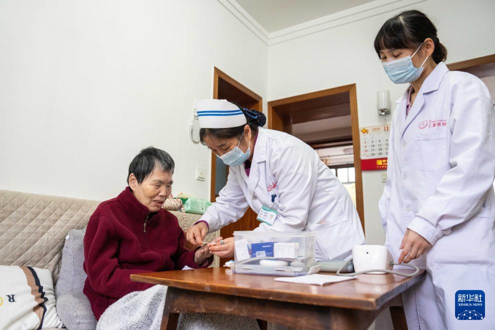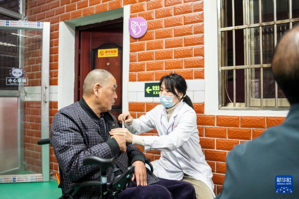 11月6日,在長沙市望城區(qū)高塘嶺街道中南社區(qū),醫(yī)務(wù)人員定期上門為行動不便的居民(左)檢查身體。