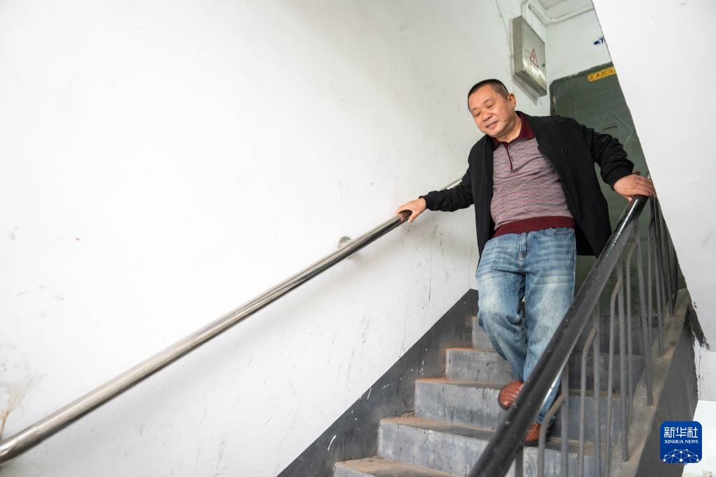 11月6日,在長沙市望城區(qū)高塘嶺街道中南社區(qū),行動不便的居民使用無障礙改造過的樓梯扶手自行走下樓梯。