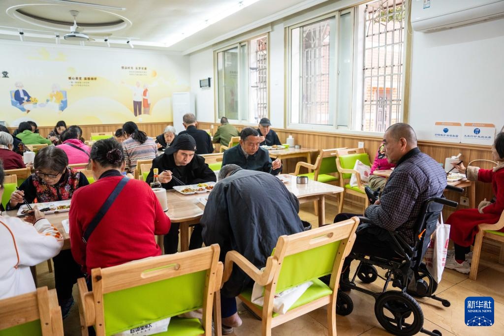 11月6日,在長沙市望城區(qū)高塘嶺街道中南社區(qū)睦鄰食堂,當(dāng)?shù)乩夏耆思皻埣踩耸吭谟貌汀?/p>