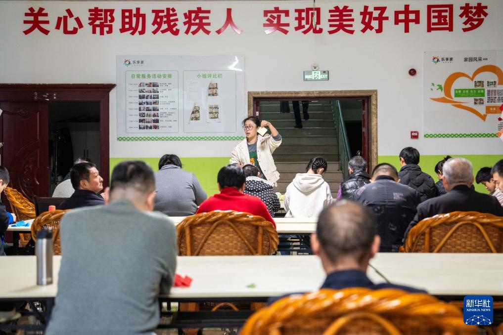 11月6日,在長沙市望城區(qū)怡康心智殘障人士托養(yǎng)中心,工作人員(左二)為殘疾人士進(jìn)行職業(yè)技能培訓(xùn)。