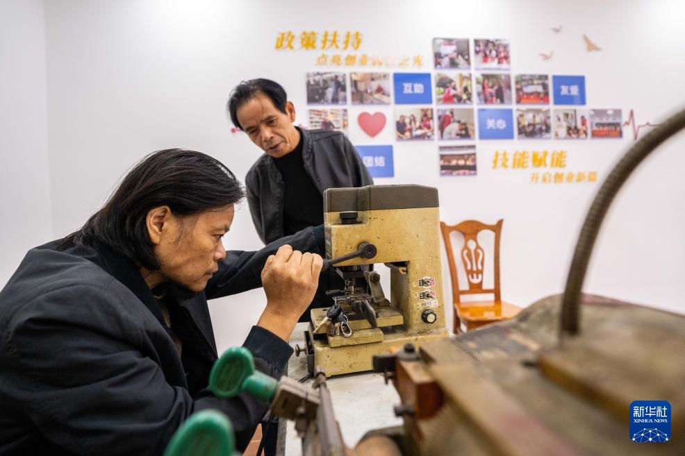 11月6日,在長沙市望城區(qū)高塘嶺街道中南社區(qū),行動不便的居民(左)在社區(qū)免費提供的助殘小屋里為居民配鑰匙。