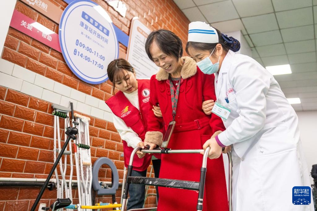 11月6日,在長沙市望城區(qū)高塘嶺街道中南社區(qū),志愿者及醫(yī)務(wù)人員幫助行動不便的居民(中)使用康復(fù)器具。