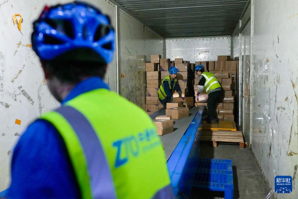 11月11日,在位于寧夏銀川市賀蘭縣的中通快遞寧夏管理中心內,工作人員進行卸車作業。