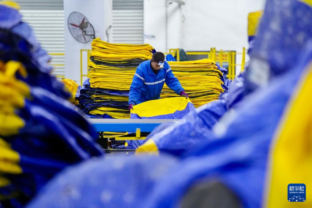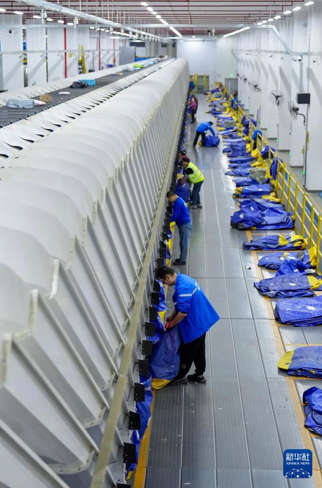 11月11日,在位于寧夏銀川市賀蘭縣的中通快遞寧夏管理中心內,工作人員整理拆包作業后的快遞袋。