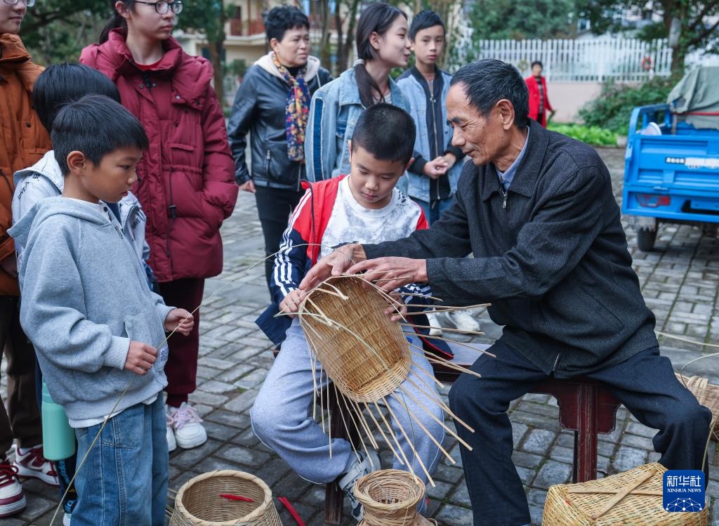 11月12日,在長興縣泗安鎮羅家地村的文化廣場,竹編藝人指導學生們學習竹編技藝。