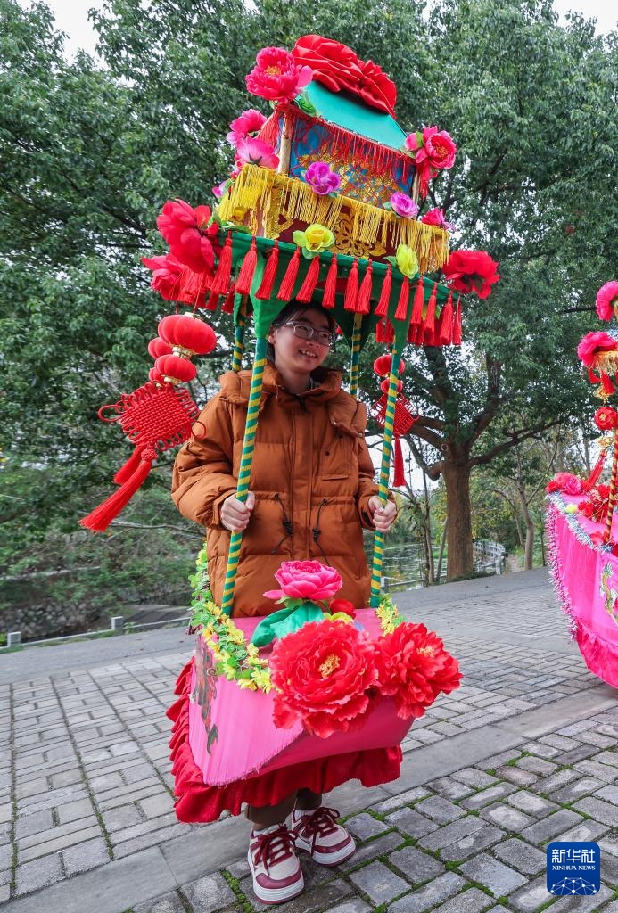 11月12日,在長興縣泗安鎮羅家地村的文化廣場,一名中學生在體驗傳統的旱船技藝。