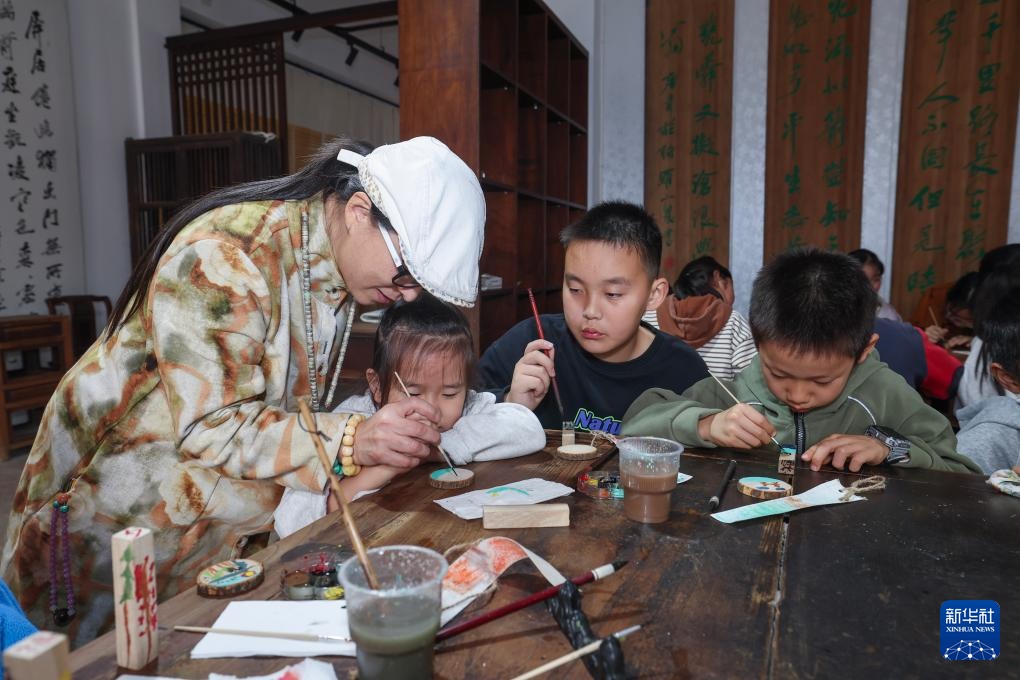11月12日,在長興縣泗安鎮羅家地村的愛心驛站里,學生們在木條上進行繪畫創作。
