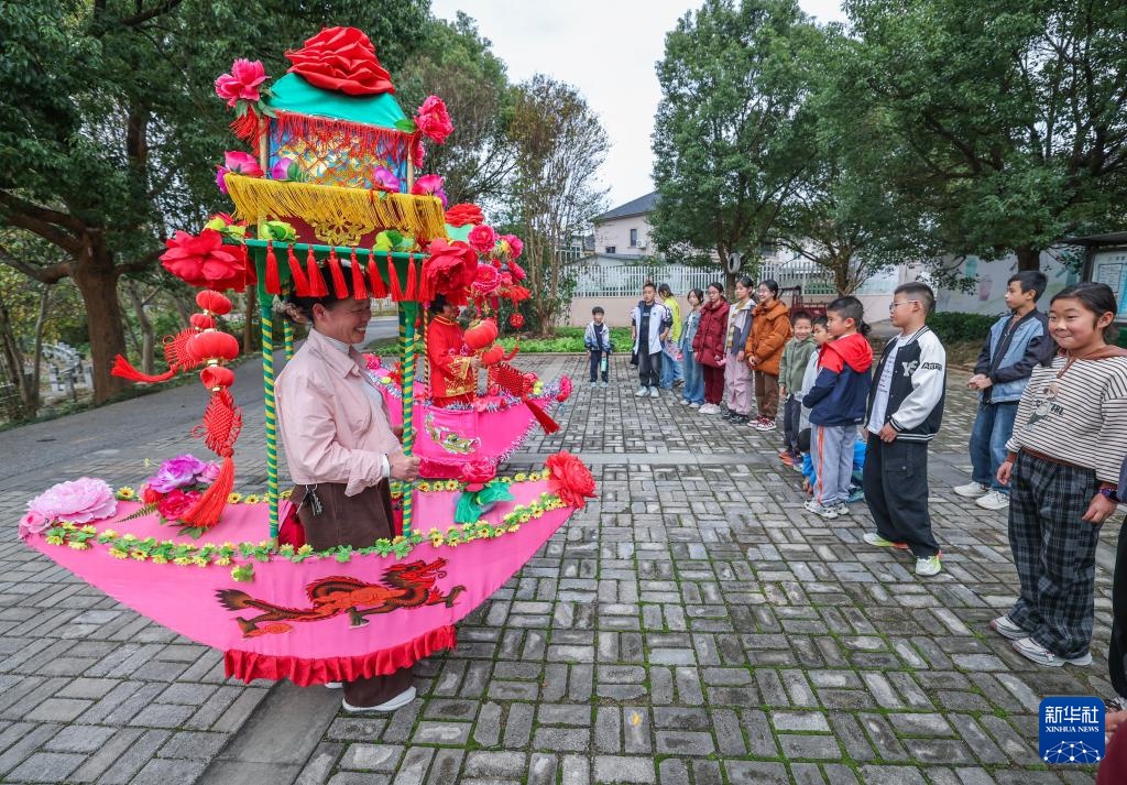 11月12日,在長興縣泗安鎮羅家地村的文化廣場,民間藝人給學生們示范當地傳統的旱船表演。
